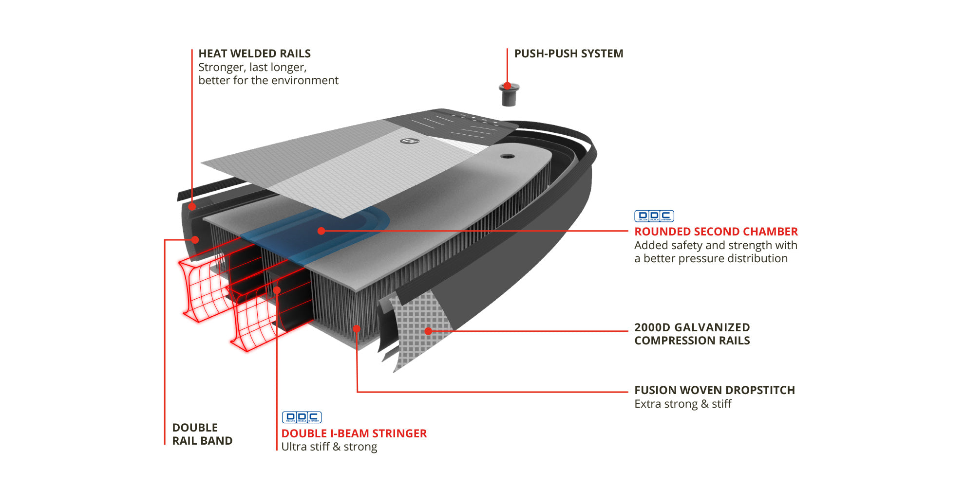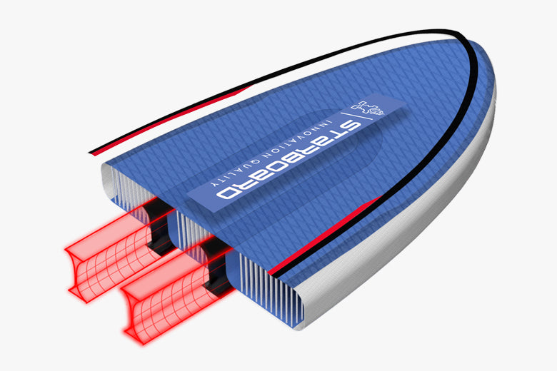 Every Starboard inflatable paddle board features welded rails. The Welded Rail Technology creates a complete airtight, mechanically bonded seam without the risk of glue weakening over time. This makes Starboard inflatable paddle boards stronger and longer lasting.