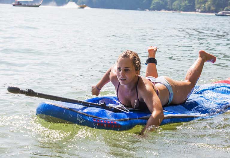 The innovative chamber doubles the sidewalls and acts like rollable I-BEAMS. Starting just behind the standing area and continuing towards the front, the chamber is placed in the most critical area for flex and reduces deflection by 1.8 cm. The feeling of paddling with the stiff Double I-BEAM stinger is getting very similar to a hard board propelling inflatable technology one step closer to a “hard board” feel.