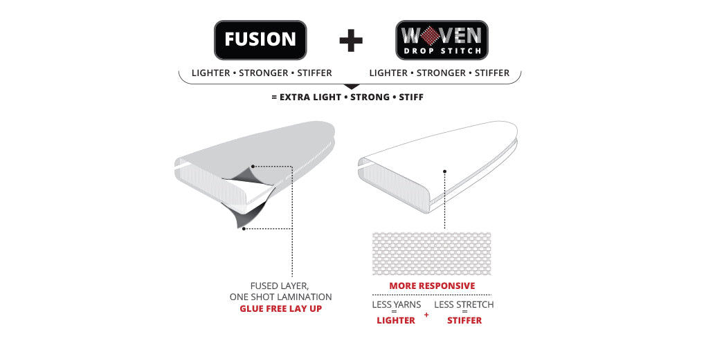 The woven thread structure works like an internal skeleton, giving your inflatable board the stiffness and feel of a hard board. At the same time, reduced material stretch and fewer yarns mean a lighter board that’s easier to carry, faster to paddle, and more fun on the water.
