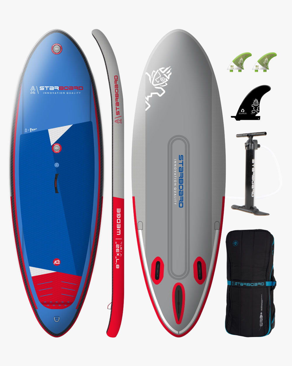 The 8’7 ” x 32” is based on the composite Wedge board of the same size. Its width provides all the stability necessary and the shorter length make the board more maneuverable.