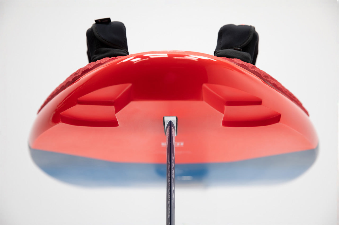Red and white 2025 Carve Windsurf Board by Striker with blue accents