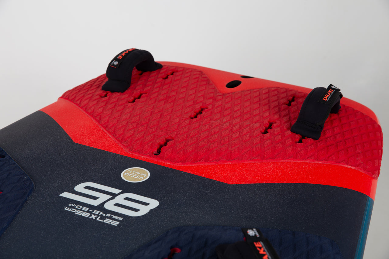 The very long flat bottom shape lets the board glide into take off speed and the cutaways helps release so you can take flight. The huge V shape from the middle to the nose makes sure that the touch downs are “money back” guarantee smooth.