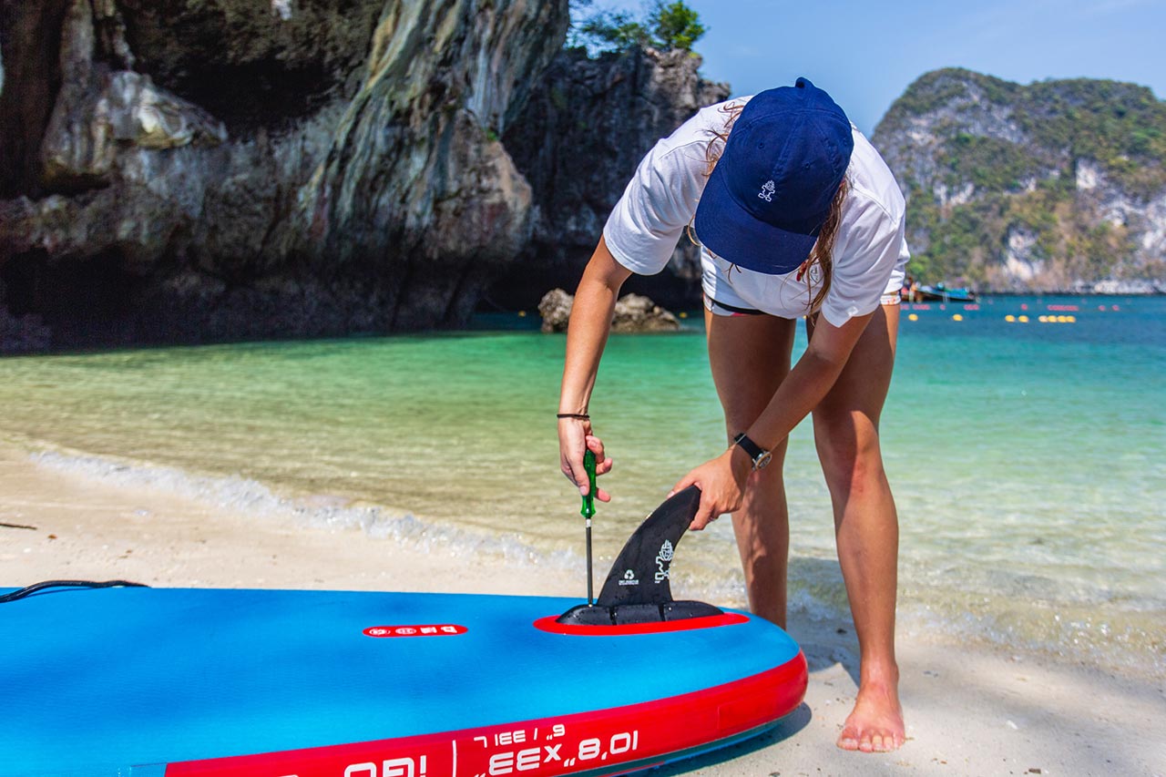 Pack your favorite paddleboard with the Tiki pump and 3-piece paddle in a compact roll bag for easier, more convenient transport. The patented 3-piece foldable fin box allows you to roll the board instead of folding it, reducing packing size by 33%.