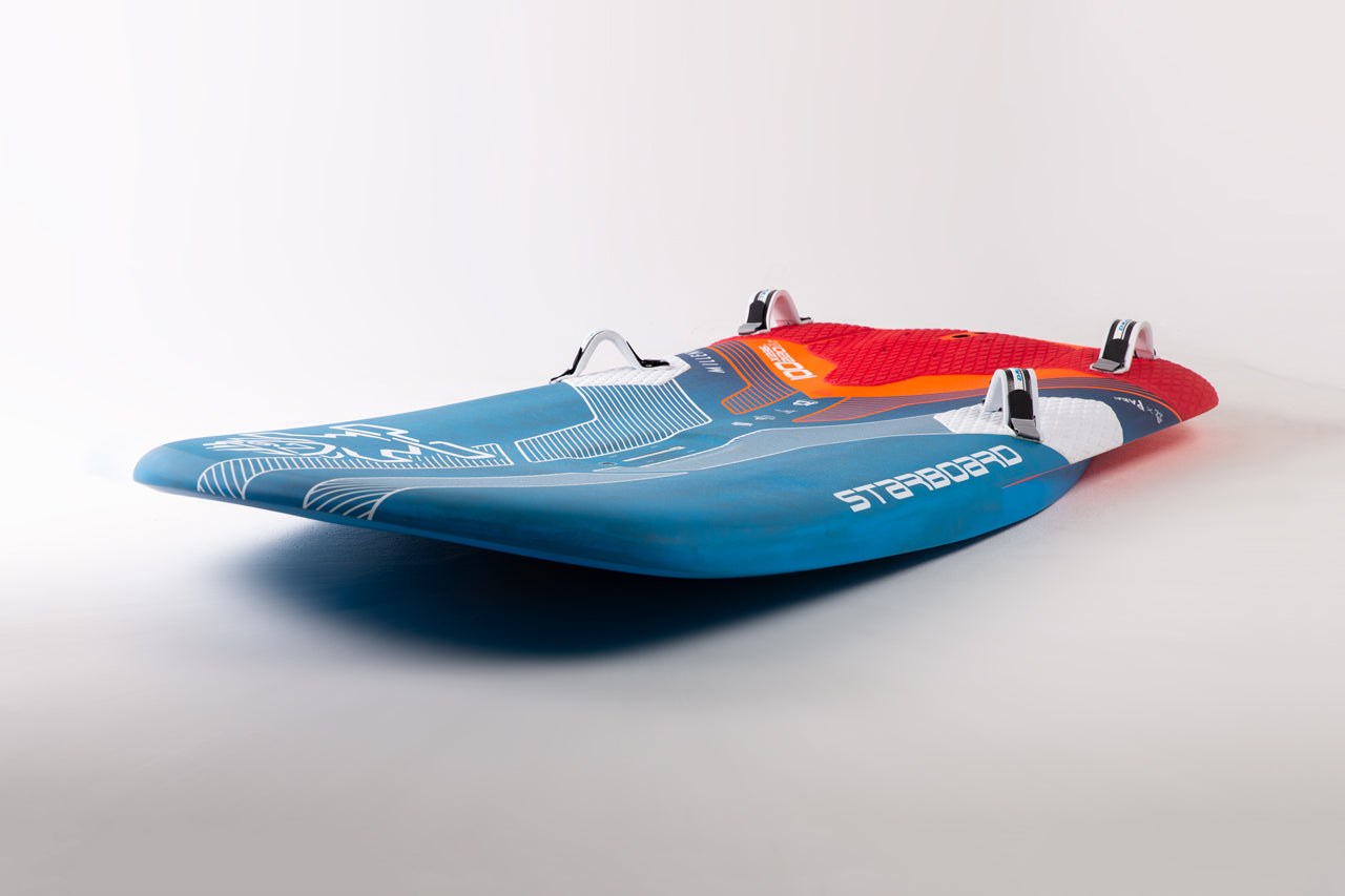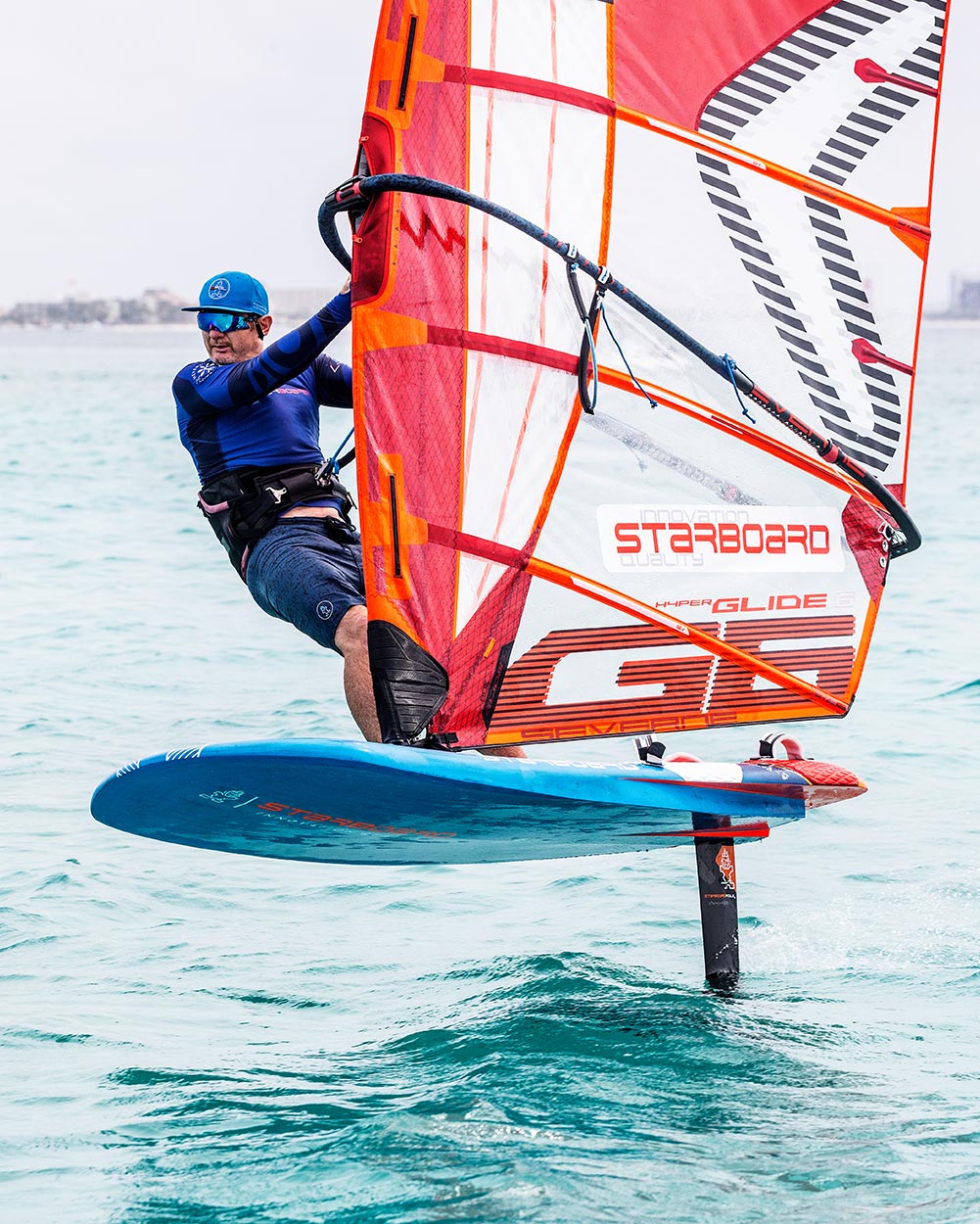 Blue and orange Starboard Glide 5.6 windsurfing board with red sail