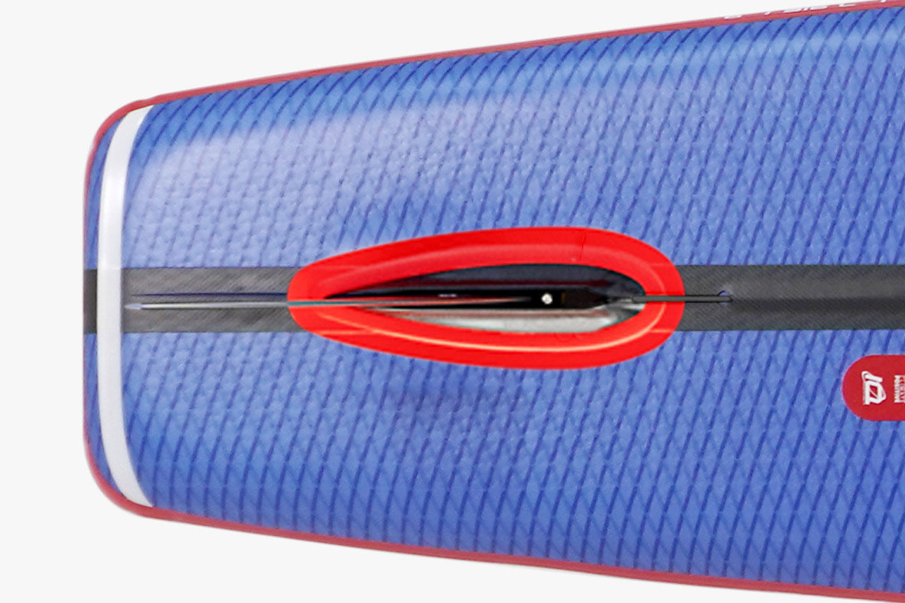 The free-flowing aramid cord locks the board in shape when inflated, creating a solid trustworthy hull sensation. It is attached to the nose, goes under the bottom and ends at the fin box. The preset cord is slightly shorter than the board so, when the board inflates, the cord comes under tension and stiffens the board significantly. We measured 1.8 cm less hull deflection in testing and World Champion Connor Baxter swears by it.