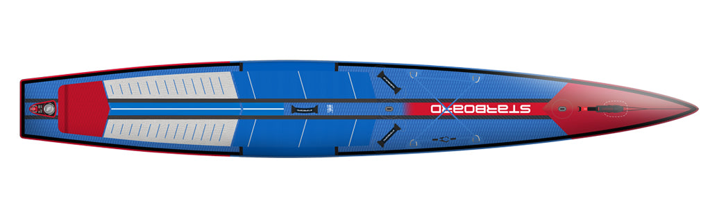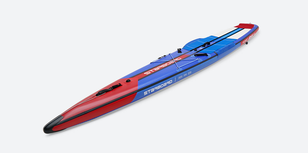 The response sensation you expect from a race board is ensured by the patented free-flowing aramid cable that acts as a spring when it comes under tension when the board is inflated. The carbon bottom and deck twin stringers increase the board’s stiffness.