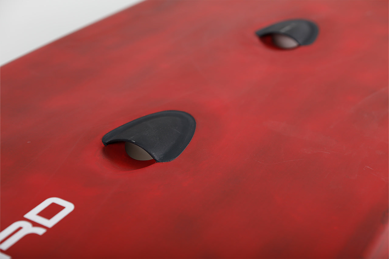 New Hybrid dugout design blends high rails in the standing area for open ocean control, with a flat deck tail for maximum stability in downwind, surfing, and turning.