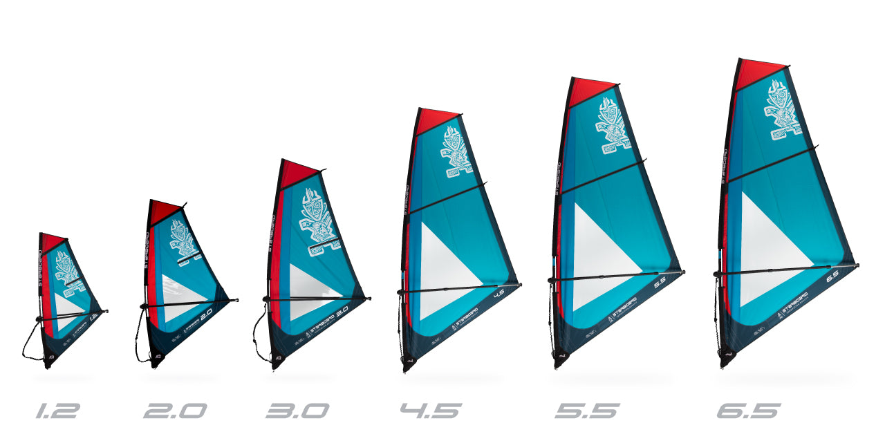 2.0, 3.0, 4.5, 5.5, 6.5: The compact version of the sail package. With the three-piece mast for the 2.0 - 3.0 and four-piece mast and three-piece boom for the 4.5 - 5.5 - 6.5 everything collapses into a small bag that’s convenient to carry and store. Improved sail design with a longer second batten, stiffer boom clamp and a more durable universal joint.